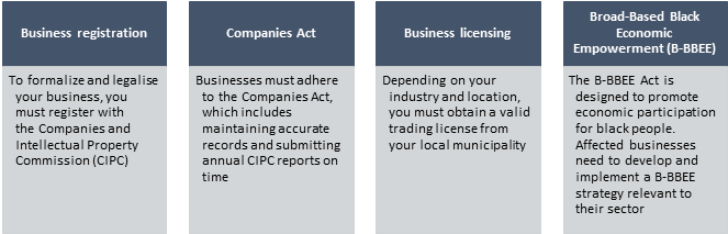 Flowing from the first pillar of company registration with the Companies and Intellectual Property Commission (CIPC), there is also a need to formalize and legalise your business with the relevant industry regulator to maintain compliance with South African legislation.