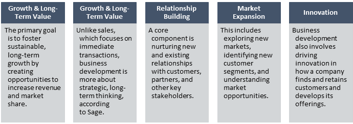 Business development is a process for creating long-term value by identifying new growth opportunities, markets, and relationships to expand a company’s reach, profitability, and overall success. It involves a range of activities including strategic planning, market research, product development, sales, marketing, and partnerships, all focused on future growth rather than just immediate transactions.